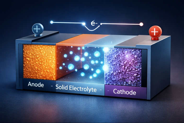 A solid-state battery is a type of rechargeable battery that uses a solid electrolyte instead of the liquid or gel electrolyte found in conventional lithium-ion batteries. In a solid-state battery, lithium ions move through this solid layer between the anode and the cathode during charging and discharging. This design improves safety by eliminating flammable liquids and also enables the use of high-energy electrode materials, such as lithium-metal anodes, which can significantly increase energy density. As a result, solid-state batteries are widely considered a key next-generation technology for electric vehicles, portable electronics, and future energy-storage systems in both the US and European markets.